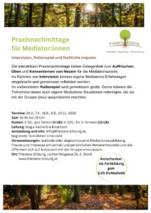 Voraussetzungen: laufende oder abgeschlossene Mediationsausbildung.